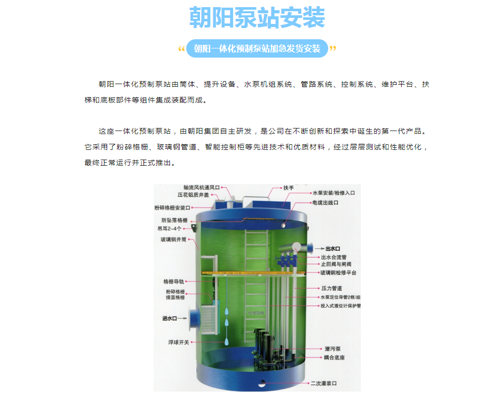 朝陽一體化預(yù)制泵站多種款式,接受客戶要求定制。泵站常規(guī)直徑1.2-4.2m,筒體高度1.6-24m,進(jìn)出口徑50-500mm,流量范圍10-5200m2/h,揚(yáng)程范圍5-65m。接受客戶按需制定方案。